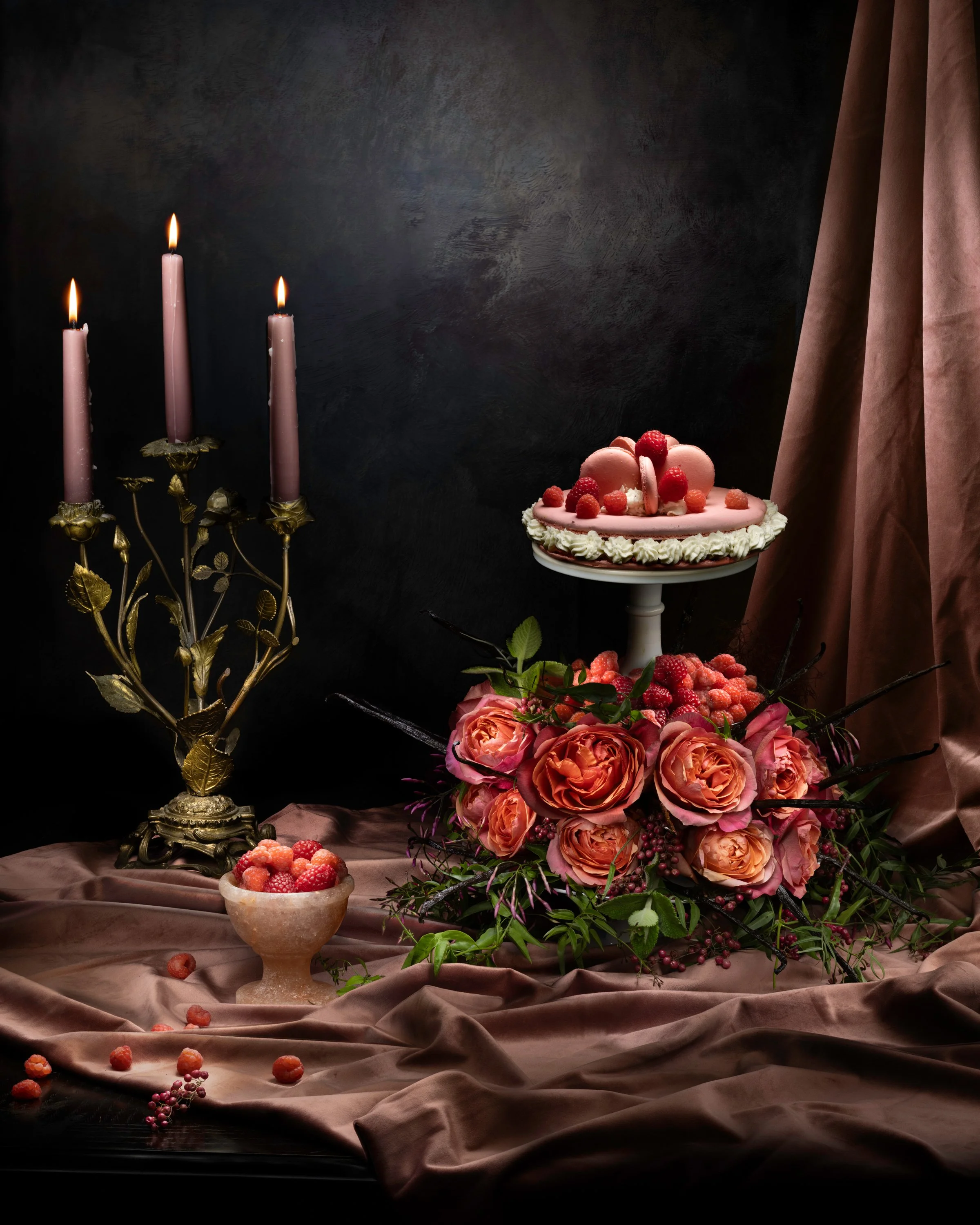 A whimsical macaron still life scene. Dark, editorial dessert photography by Nightflare Creative.